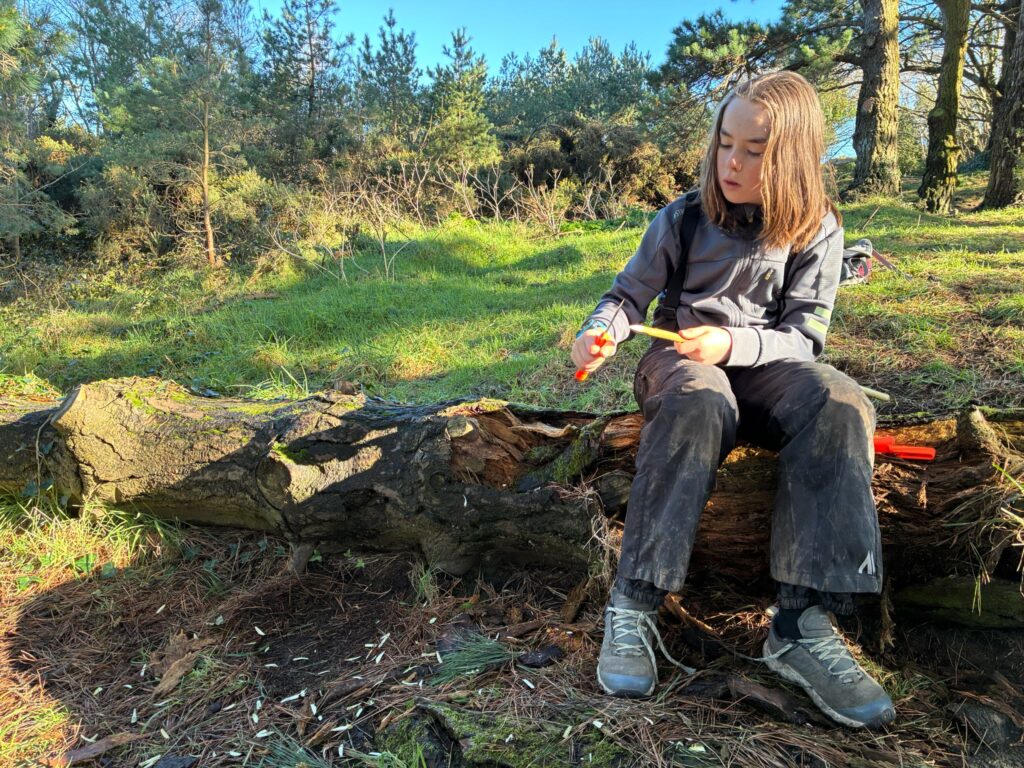 During our break we gathered for wild tea and a story. We spoke about some seasonal plants that can be found at this time of year with one group collecting gorse flowers and enjoying the coconut fragrance. We spoke about how it was important to take only little and leave for our pollinators.
