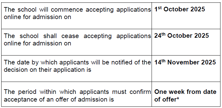 The following are the dates applicable for admission for Junior Infants. Please see the Annual Admissions Statement for more details.