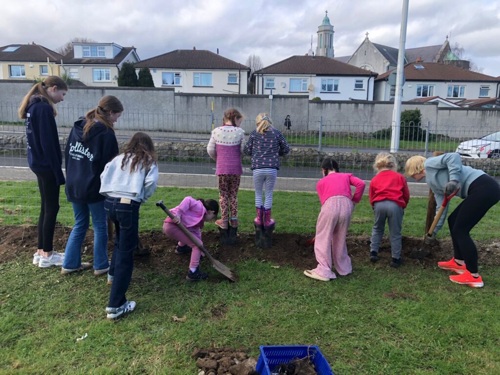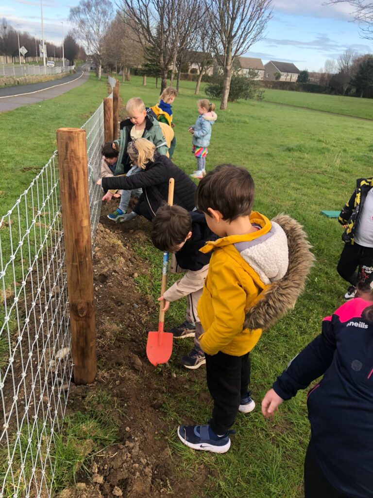 ‘On Monday, Tuesday and Wednesday every student in DSP went out to Sallyglen to plant a hedgerow along the fence. We sang a song, did fun activities and helped to plant trees. We hope to see the trees grow over the years and we hope the trees help the climate.’