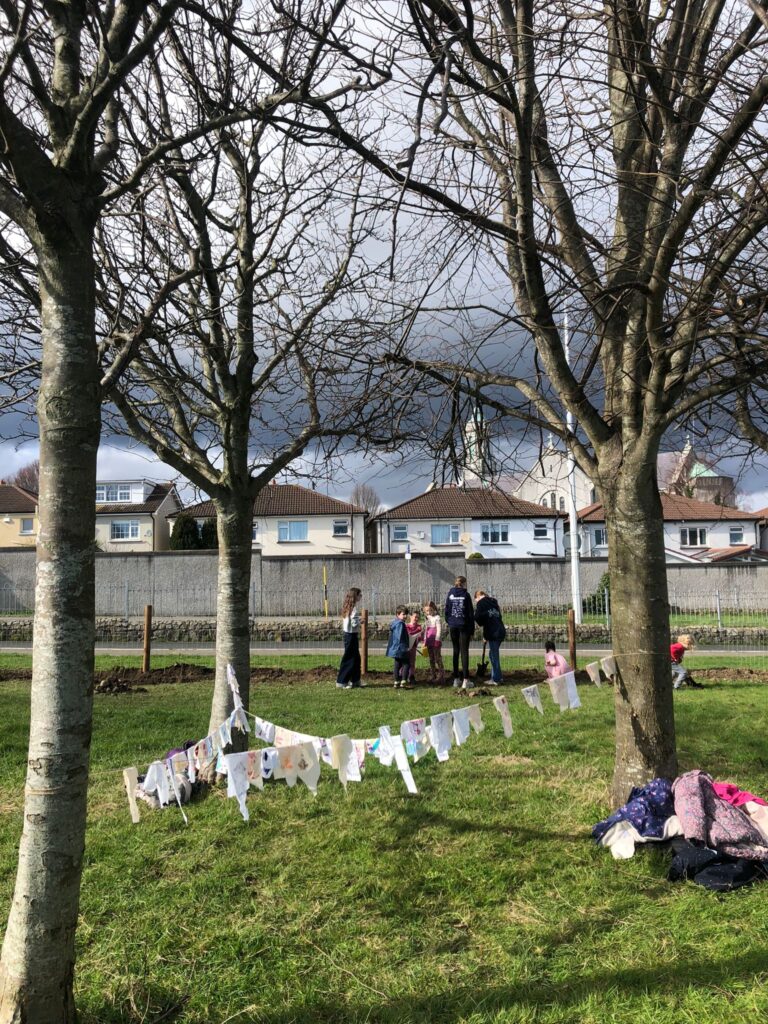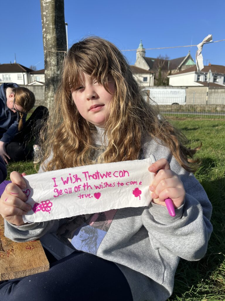 ‘We had great fun in Sallyglen. We sang a lovely song about the bees and the trees. We made wishes. we wrote them down and tied them to the string. We go to dig holes in the ground and put plants in. They will grow into a big green hedgerow.’