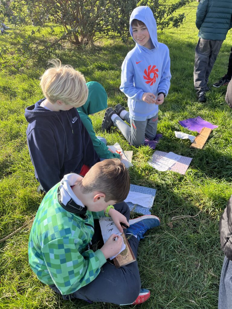 On Thursday we went out to Sallyglen and split into three groups. Then we sat in a circle and wrote our wishes for Sallyglen in the future on pieces of cotton sheets. After that we tied our wish rags to a rope. Next we picked a partner or a group of three, got a spade and started digging our hole. Sarah the instructor gave us a hawthorn or a holly tree. After we finished planting our trees we thought about how one day those plants will grow to be giant trees. We ended our session by singing a song Hey Hedgerow. We had a great time.