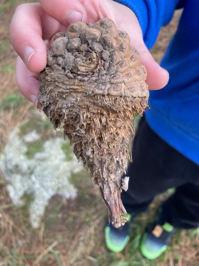 “I’m putting this pine cone under the mushroom to keep it dry.”